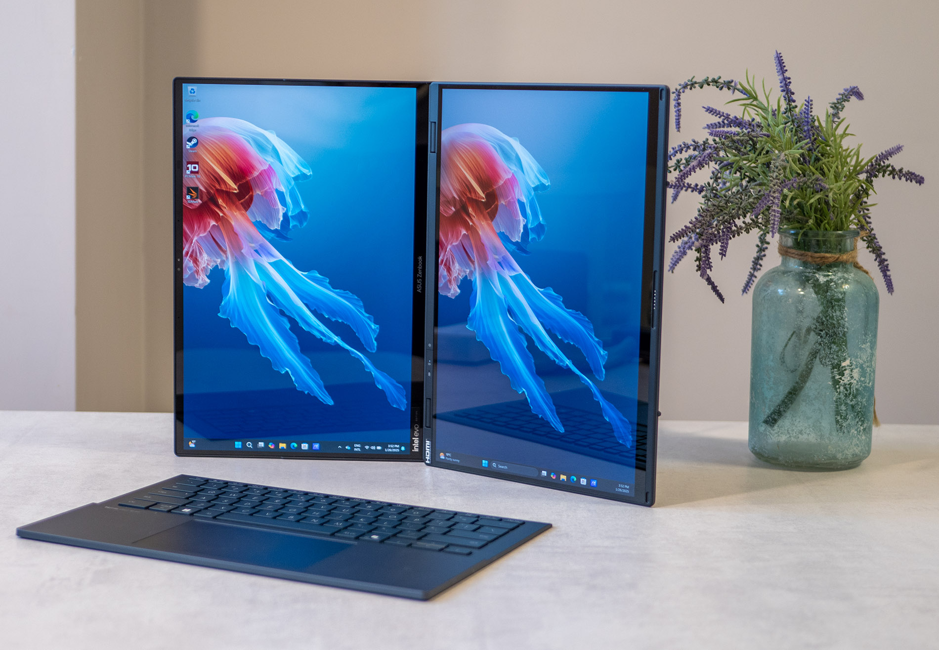 ASUS Zenbook Duo е с цена около 5000 лв., което го поставя в най-високия клас лаптопи. Моделът определено обаче се отличава от познатите ни устройства. Той има два отлични екрана, които го правят много гъвкав по отношение на начините за работа и забавления. Те могат да са в хоризонтална или вертикална позиция, предоставяйки висококачествена картина.