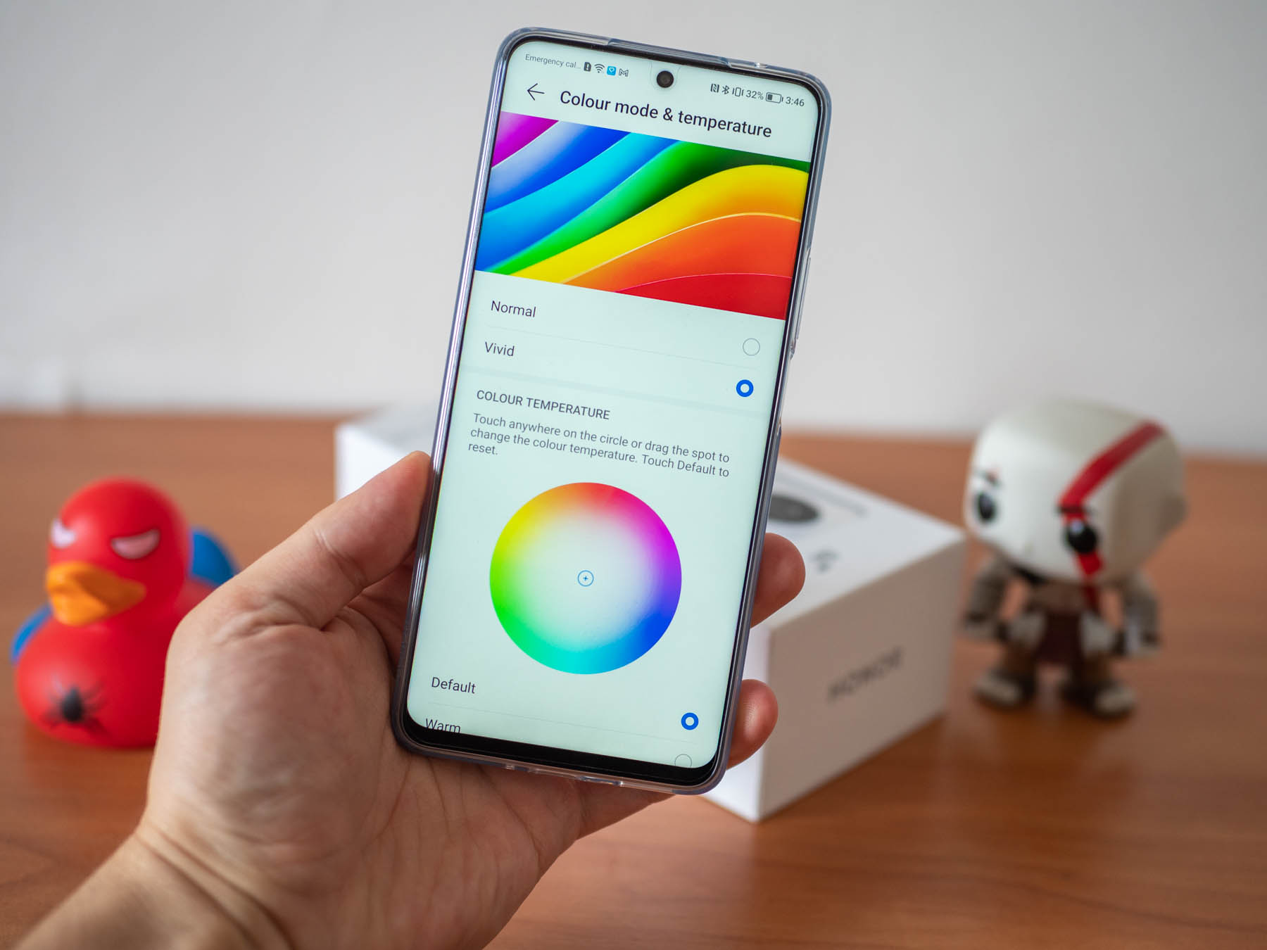 Отпред е 6.81-инчовият дисплей с резолюция 2388x1080 пиксела, който поддържа честота на опресняване до 120 херца. Компромисът на Honor тук е, че това е LCD панел, който спрямо OLED конкурентите си е с леко по-размити цветове и по-ниски ъгли на видимост. Въпреки това картината е приятна и с висока яркост, а анимациите в интерфейса са много плавни благодарение на високата честота на опресняване. Обичайни за този клас са и рамките около екрана, които са тънки, с изключение на по-дебелата брадичка. В горния край на екрана има отвор за селфи камерата, на която бързо ще спрете да обръщате внимание.