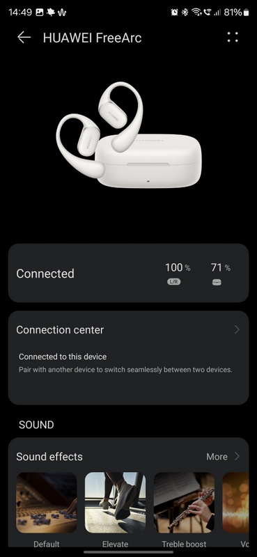 През приложението освен бутоните за управление можете да активирате еквалайзер като изберете готов профил или създадете собствен; да активирате допълнителна сила на звука и режим на ниска латентност; да откриете слушалките, ако не знаете къде са оставени; да обновите софтуера и да видите заряда на батерията. Много потребители може да носят тези слушалки, докато тренират без телефона да е близо до тях и затова Huawei е включила антена с двоен резонатор, за която твърди, че осигурява връзка на разстояние до 400 метра на открито или пък в офис с площ 100 кв. м. Нямах никакви проблеми с връзката по време на тестовете.