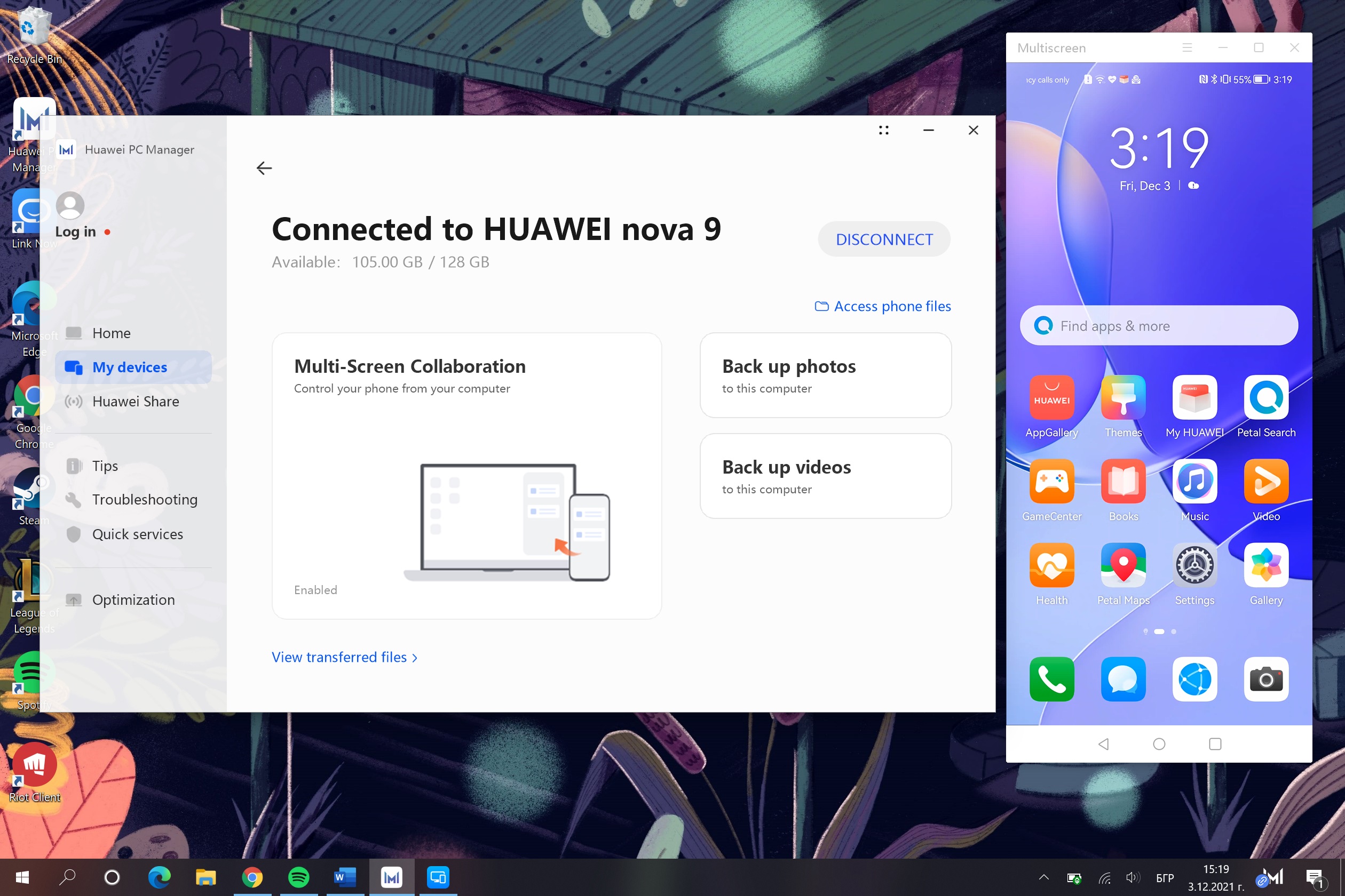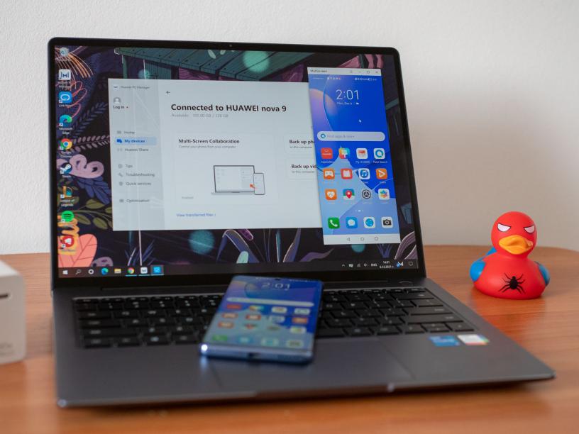 Другият елемент е самото приложение, което разполага със секция My Devices, в която можете да намерите телефон, таблет и дисплей Huawei. Така през Huawei PC Manager можете директно да управлявате телефона си, да провеждате разговори и да използвате всички негови функции. Оттам можете и много лесно да прехвърляте файлове, снимки и видеа, както и да направите автоматичен бекъп. Това може би е най-удобният елемент от приложението, особено ако сте инвестирали в екосистемата на Huawei.