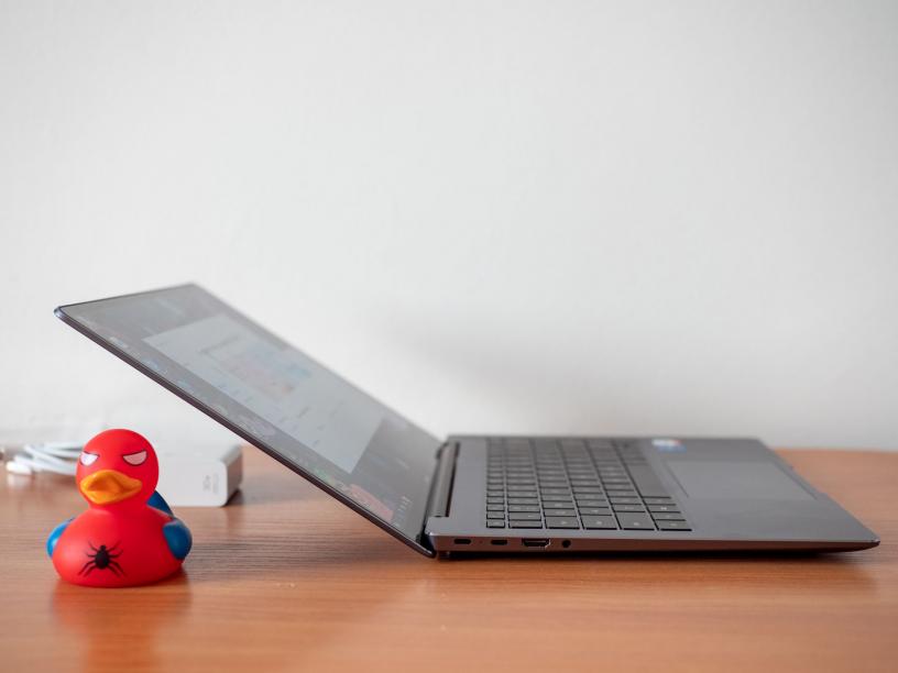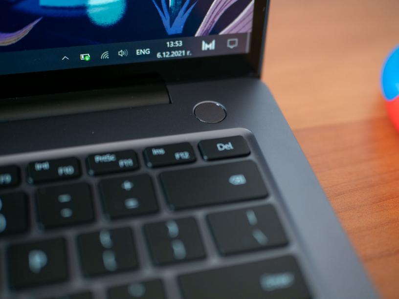Над клавиатурата е отделният бутон за включване на лаптопа, който също така има сензор за пръстов отпечатък. Вляво са два USB-C входа, които служат за зареждане и поддържат DisplayPort, като във версията на лаптопа с процесор Intel Core i7 единият поддържа и Thunderbolt 4. Добрата селекция портове се допълва от HDMI вход и жак за слушалки, отново вляво, както и един USB-A вход вдясно. Голямата липса е слот за SD карти, но това не е изненада, защото MateBook 14s всъщност е фокусиран върху офис работата, а не толкова върху създаването на визуално съдържание.