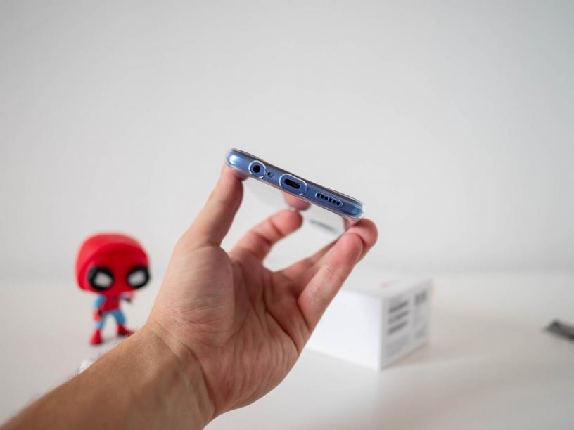Рамката на телефона е пластмасова, като вдясно са бутоните за силата на звука и този за отключване. В него е вграден сензор за пръстови отпечатъци, който работи много точно и бързо. Отдолу са решетката за говорителя, 3.5 мм жак за слушалки и USB-C входът. Вляво е слотът за SIM и microSD карти.