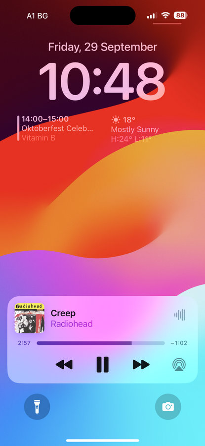 В същото време смартфонът се е сдобил с Dynamic Island, който миналата година беше наличен само в Pro моделите. Това е елипсовидна зона, която заменя изрязването в дисплея, а в нея са разположени предната камера и сензорите за Face ID. Тази зона е интегрирана в системата и ползва приятни анимации за осигуряване на разнообразна информация от различни приложения – например активиране на Face ID, индикация за активен таймер или диктофон, навигационни указания в Maps, плеър при слушане на музика и т.н.