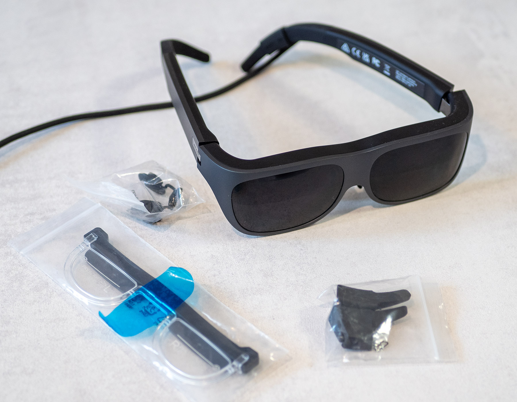 Заедно с конзолата Legion Go имахме възможност да изпробваме и очилата Legon Glasses. Те могат да бъдат свързани чрез USB Type-C кабел към разнообразни устройства, включително конзолата, смартфони, компютри, таблети и т.н.