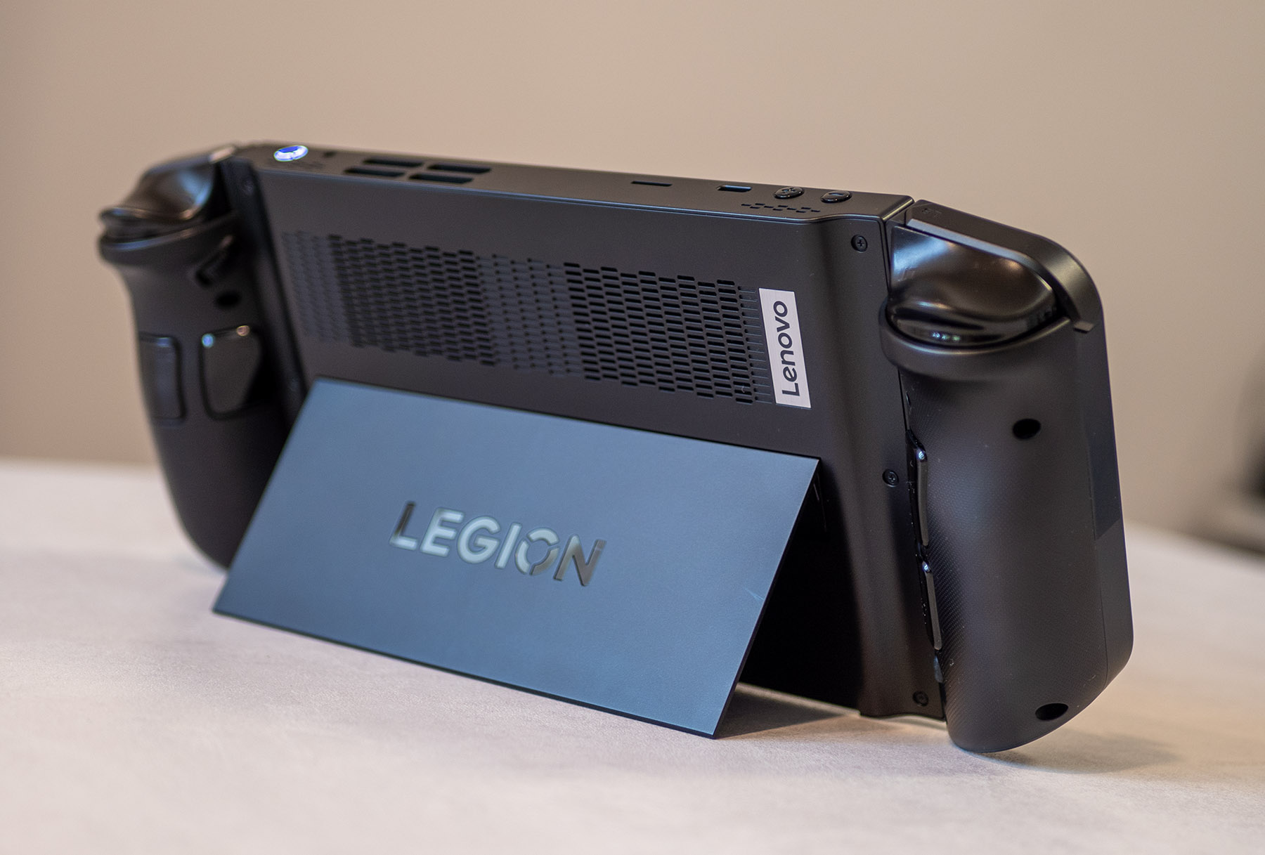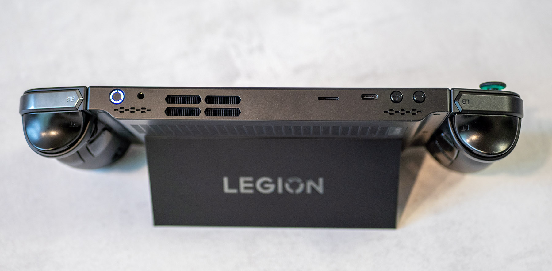 Lenovo Legion Go може да се определи като обемист таблет с прикачени от двете страни контролери и стойка в задната част. Върху корпуса откриваме редица отвори за охладителната система, а в горната част има бутони за включване и управление на звука. Добавени са още два USB Type-C порта, жак за слушалки и слот за памет карта.