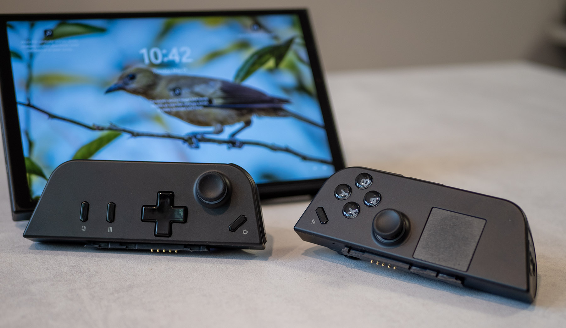 Както вече стана дума, от двете страни на екрана има откачащи се контролери Lenovo TrueStrike. Те са с Hall и вибрационни ефекти, RGB в зоната на стиковете и FPS режим. Освен с по един стик, те предлагат D-пад, ABXY бутони, няколко спусъка и др. В десния контролер е добавен тъчпад за работа с курсор.