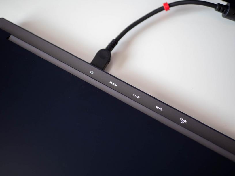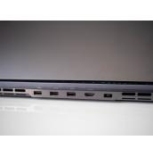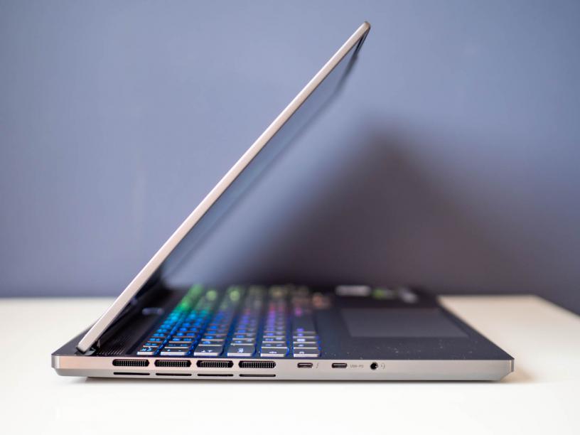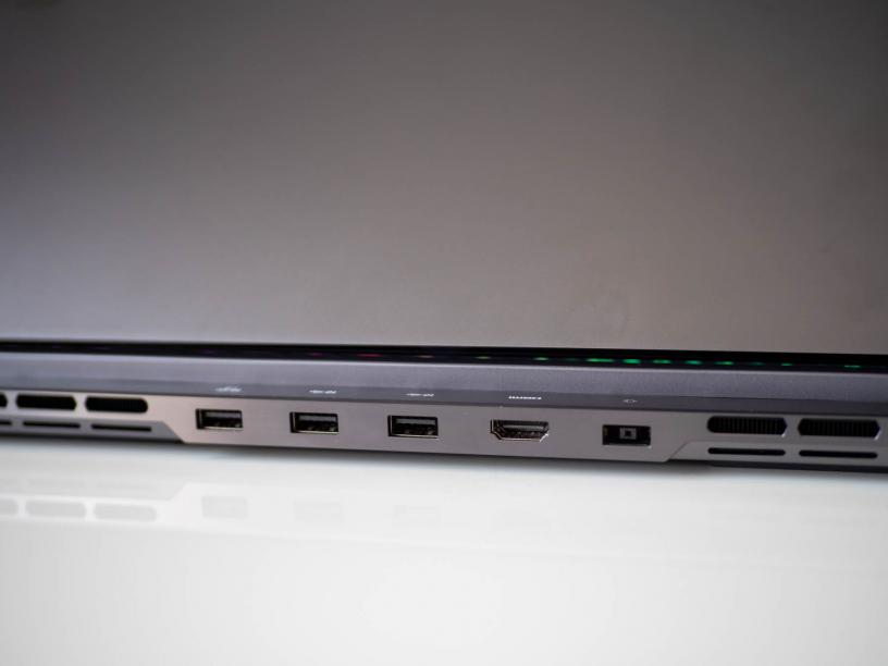 В сферата на приятните детайли са и няколко решения за портовете. На първо място е това, че най-използваните от тях са отзад - входът за включеното в кутията DC зарядно, HDMI 2.1 порт и три USB-A входа, от които единият е Always On. Върху издадената зад дисплея част има светлинни индикатори за всеки порт, така че можете да ги ползвате по-лесно, без да трябва да обръщате лаптопа или да правите други гимнастики. Вляво са 3.5 мм жак, както и два USB-C входа, от които единият е Thunderbolt 4, а другият е USB-C 3.2 Gen 2, като първият поддържа до скорост за трансфер на данни до 40Gbps, но и двата поддържат Power Delivery и DisplayPort 1.4. Вдясно е четец за карти, както и превключвател за уеб камерата. Това разположение е чудесно, защото с него няма да имате никакви кабели, които да стърчат около дясната ви ръка, където вероятно ще е геймърската ви мишка, дори да използвате USB-C аксесоари, зареждане или външен дисплей.
