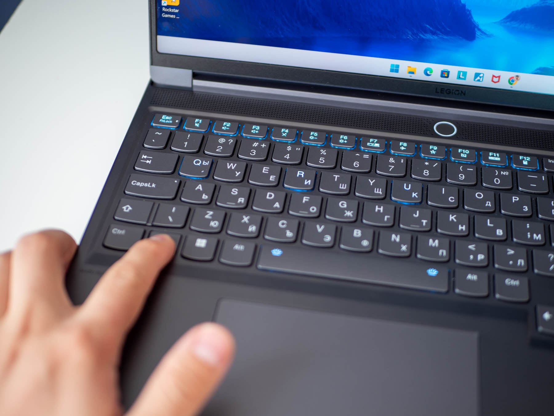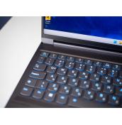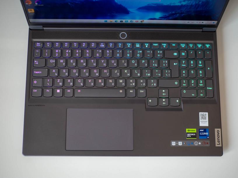 Пълноформатната клавиатура е отличителен белег на Legion Slim 7i, като основните бутони са големи и с достатъчно разстояние между тях. Бутоните на цифровия блок са по-малки, но все пак са достатъчно удобни. Клавишите са с ход 1.5 мм, което е повече от предишни модели в серията, но все пак е плитко по геймърските стандарти. Аз лично предпочитам плитки клавиатури и нямах никакви притеснения нито при гейминг, нито при писане. Може би най-големият „проблем“ при писане беше режимът на подсветка, при който светлинна вълна тръгва от натиснат бутон, което беше изключително разсейващо. За щастие, през Lenovo Vantage можете да управлявате детайлно поведението на подсветката и да ползвате до пет профила, които да променяте с клавишна комбинация.