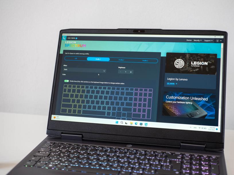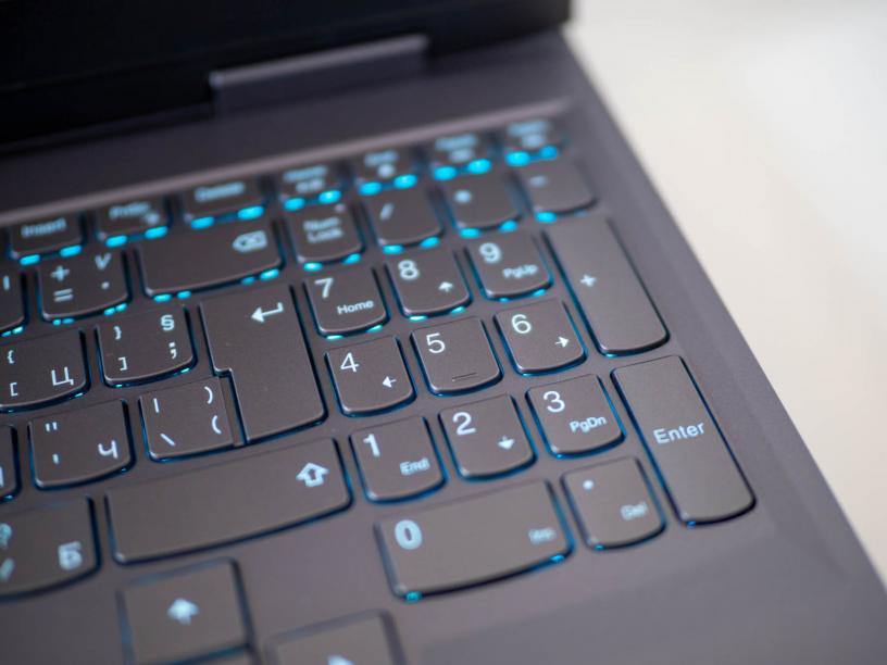 Другият "геймърски" елемент е RGB подсветката на клавиатурата, която може да се управлява от софтуера Lenovo Vantage. С него можете да изберете да свети в един цвят или да персонализирате всяка от четирите зони на подсветката, както и да използвате някой от светлинните ефекти. Клавиатурата има обичайните удобни копчета, с които сме свикнали от лаптопите на Lenovo плюс пълен цифров блок и добре отделени и удобни стрелки. Бутоните са сравнително плитки, но кликаеми и меки, което прави клавиатурата тиха и много приятна за писане. За гейминг може би е малко по-плитка от личните ми предпочитания, но всъщност с малко свикване е удобна и за тази цел.