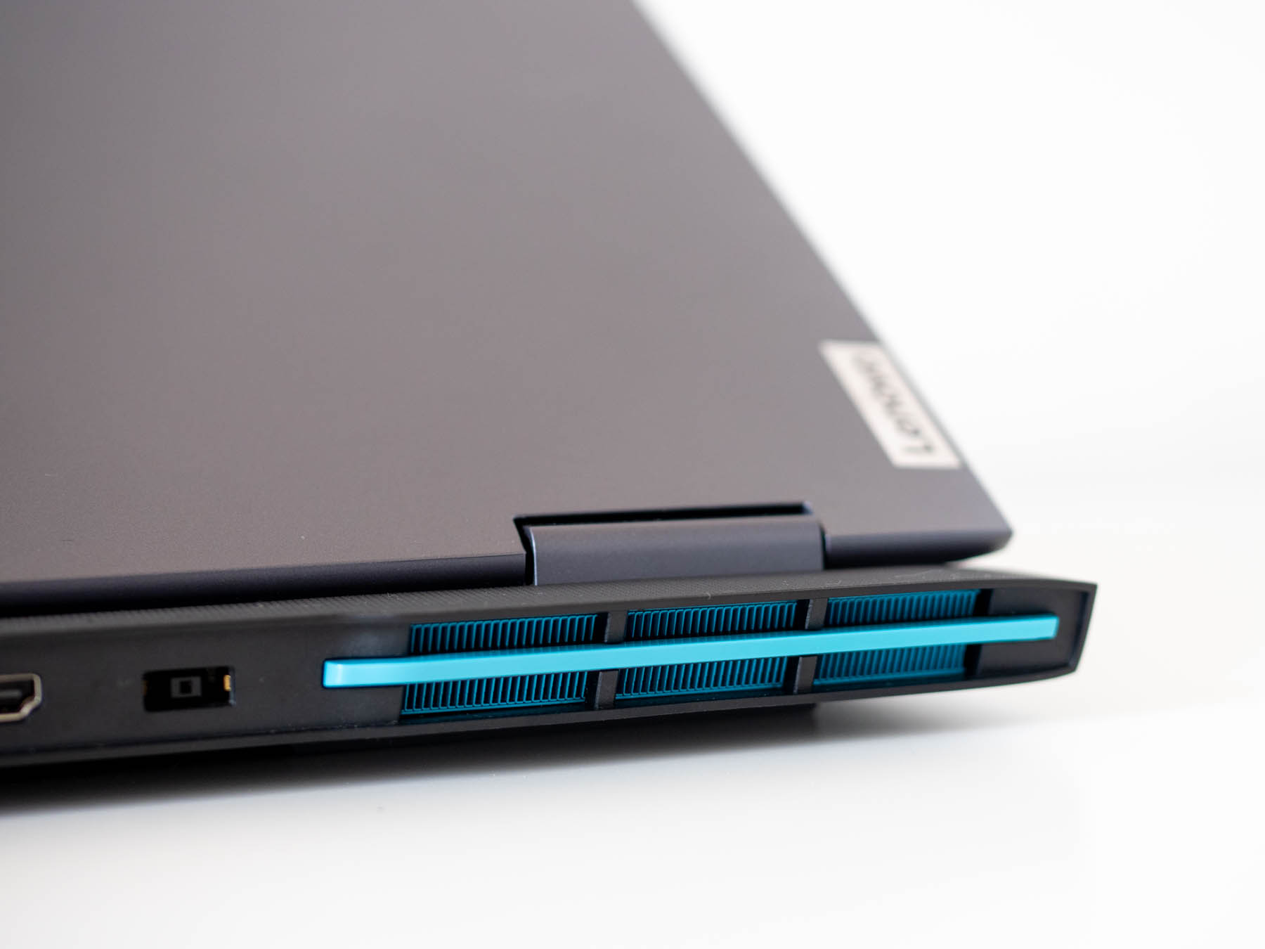 На пръв поглед LOQ 15IRH8 не дава вид на геймърски лаптоп, тъй като липсват обичайните светлини по капака, странни на вид лога или други претрупани елементи. Капакът всъщност има дискретно лого на Lenovo и брандирането LOQ, което почти се слива със сивата пластмаса. Елементът, който издава геймърската природа, са цветните детайли около решетките за охлаждането, които са в светлосин цвят и всъщност дават характер, без да се губи усещането за сдържан стил.