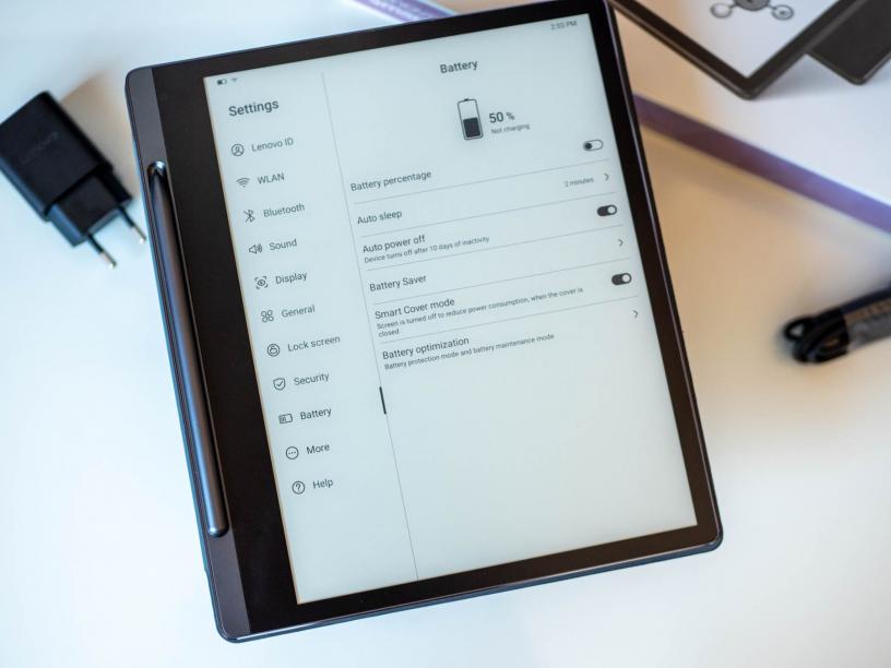 Капацитетът на батерията е 3550mAh, като при нормално ползване за четене и бележки би трябвало да можете да я ползвате в продължение на дни, дори и седмици. Аз лично смъкнах заряда от малко над 70% до около 20% за 4 дни с активно ползване, включително браузване, WiFi и инсталиране на приложения, които са по-скоро нетипични. Зареждането е бавно, като за 30 минути стига до около 30%, а за пълен заряд са нужни над два часа. В кутията има включено 10-ватово зарядно, както и кабел.