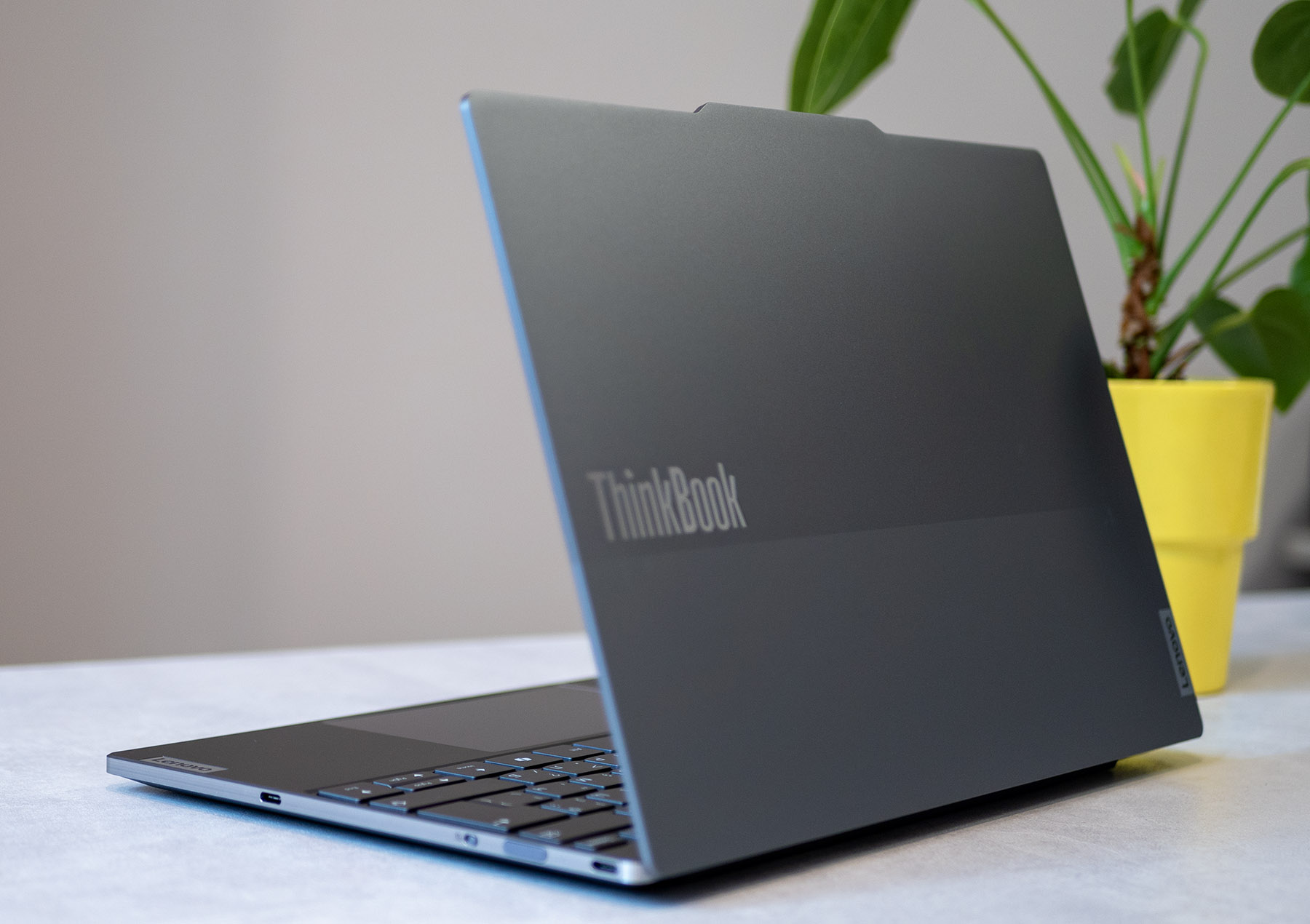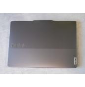 Thinkbook 13x Gen 4 изненадва приятно с дизайна си. Конструкцията е изработена от алуминий, като страничните рамки са плоски, а капакът е с двутонова разцветка в сиво/сребристо. На капака има голямо лого ThinkBook, както и значително по-малко на Lenovo.
