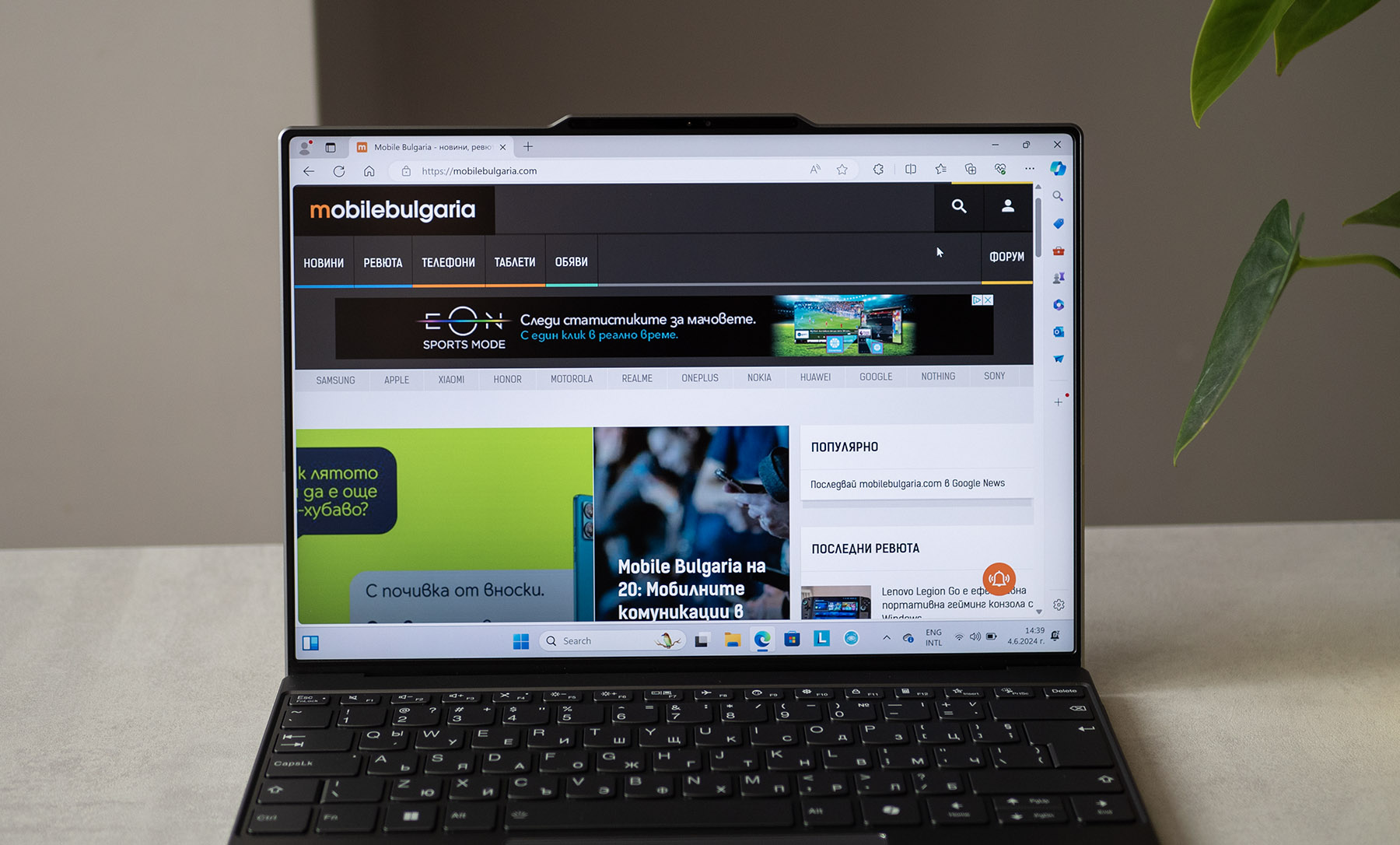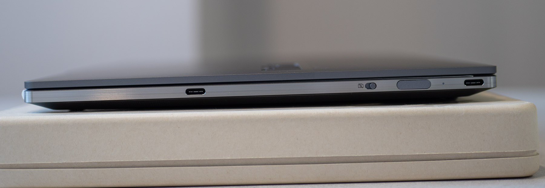 Има ограничен набор от портове, което е нормално, имайки предвид размерите. От двете страни са разположени общо 3 х USB Type-C портове, както и 3.5 мм комбиниран жак за слушалки и микрофон. Има още бутон за включване с вграден четец на отпечатъци и бутон за затвора на камерата.