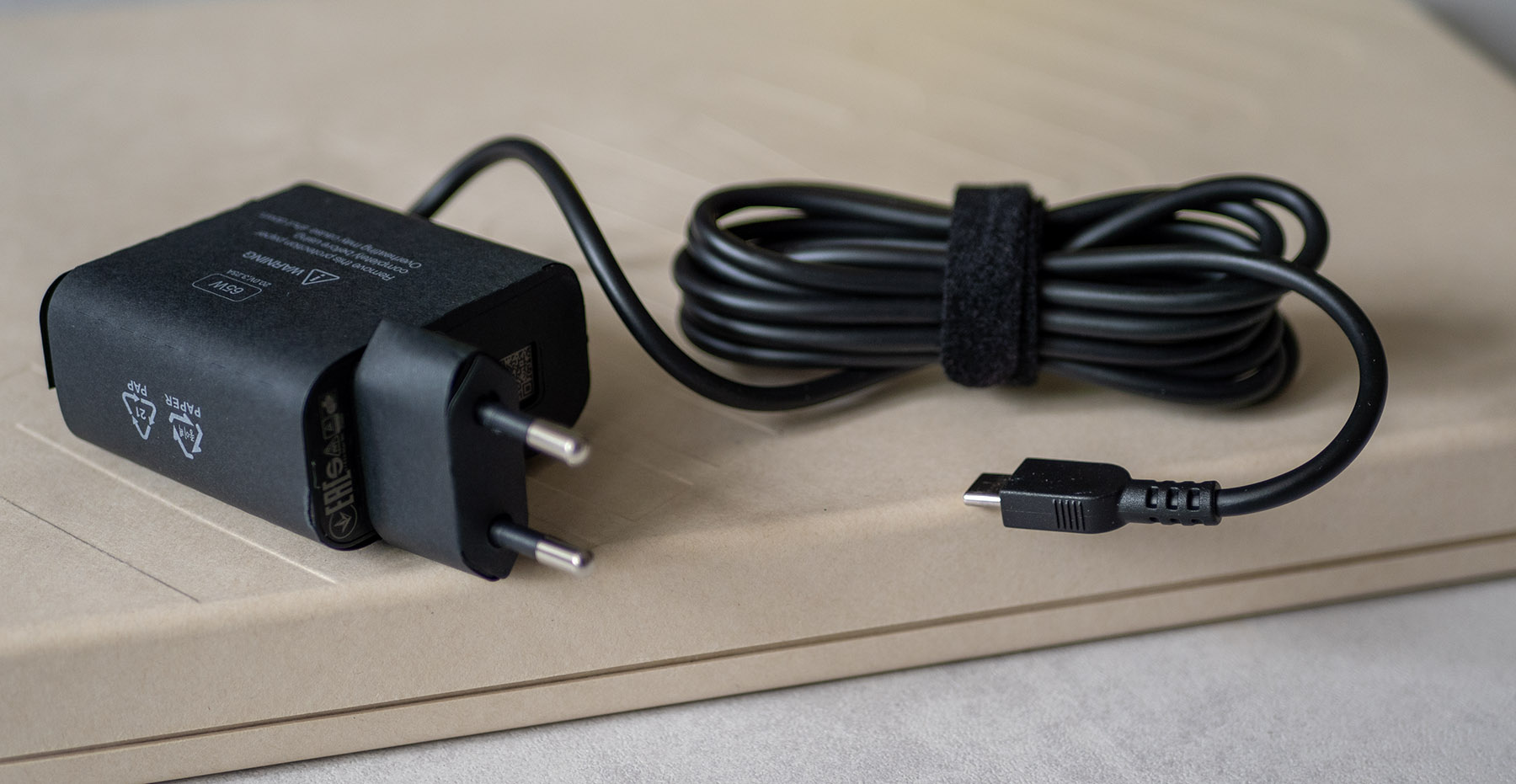 Конструкцията е тънка при дебелина 12.9 мм и лека при тегло 1.15 кг. В комплект с лаптопа идва и 65-ватово USB Type-C зарядно. Заложено е и на рециклирани материали в някои от компонентите, а опаковката е без пластмаса.