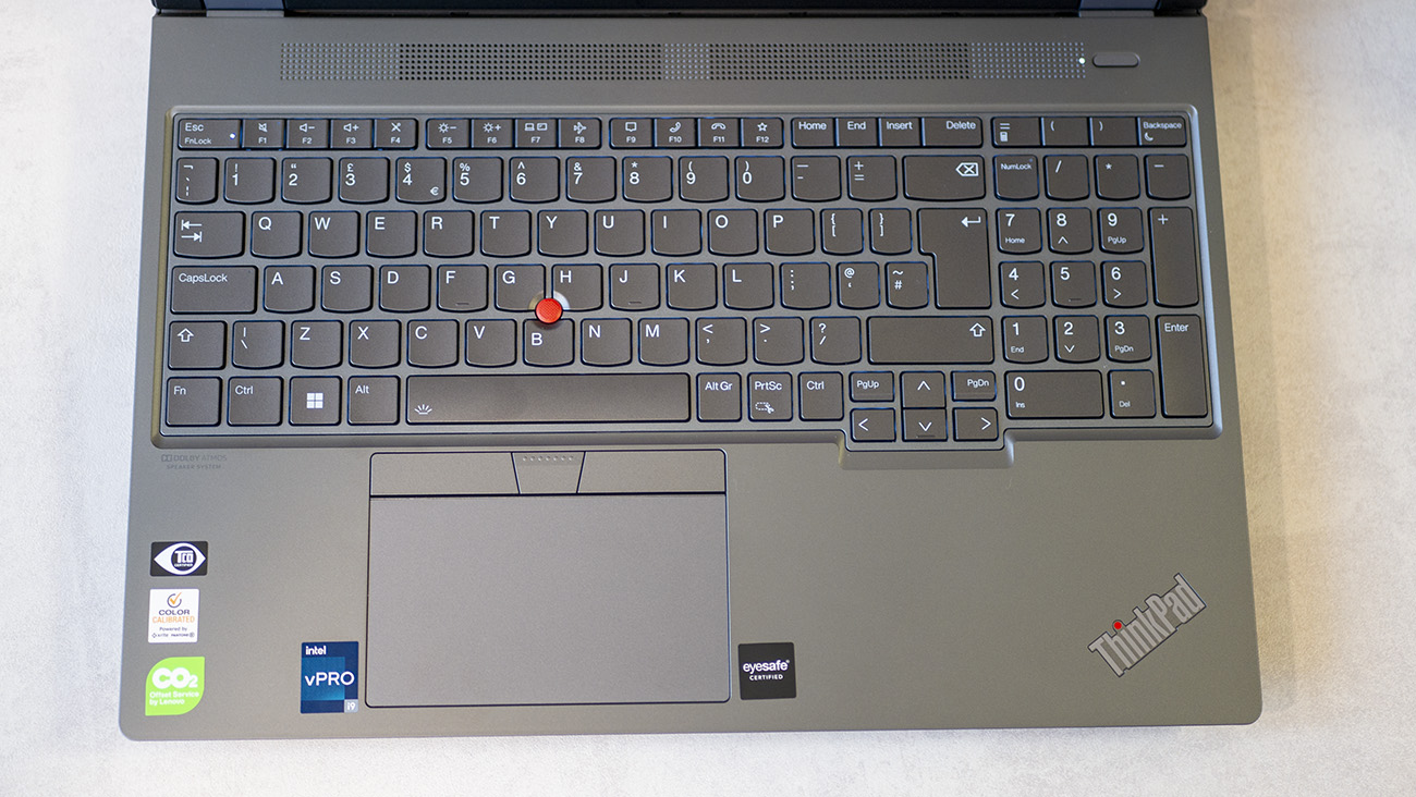 Клавиатурата е пълноразмерна и с цифров блок, като има също така ефективна система за подсветка. Бутоните са сравнително големи, но с по-ограничен ход, като въпреки това се отчита меко и осезателно движение. Тракпадът е удобен и приятен, като размерите му са адекватни, а над него е поставен познатият trackball. Опционално в бутона за включване има четец на отпечатъци match-on-chip.