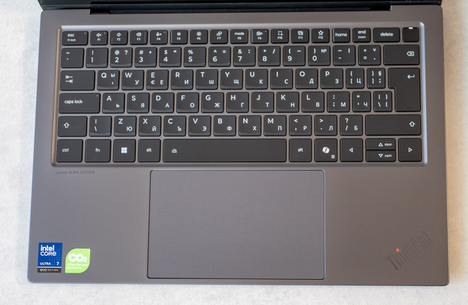 Достигаме и до друг важен елемент, а именно клавиатурата, която е с вече познатия ни нов дизайн. Той не е типичен за ThinkPad, като вече липсва легендарният TrackPoint. Има бутон за активиране на Copilot, а в бутона за включване в горния десен ъгъл е вграден скенер за отпечатъци. Самите клавиши са с нова форма с лека извивка и скосена долна част за по-лесно преминаване между тях при писане, като е налична матова текстура за покритие.