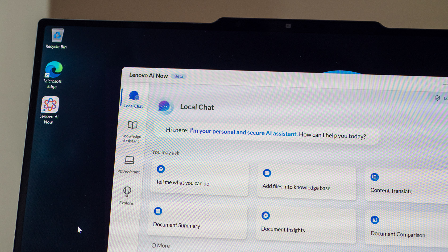 Звездата тук обаче е работещият локално AI асистент Lenovo AI Now, който може да управлява системни настройки, да търси файлове и извлича информация от тях, да полира и пише текст и т.н. Така имате универсален помощник с изкуствен интелект, който може да ви е от голяма полза в ежедневните задачи и за работа.