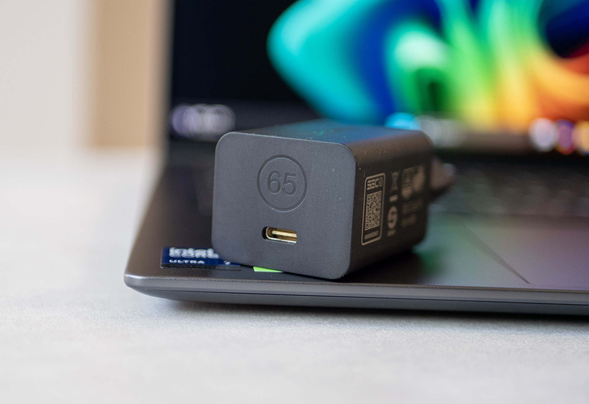 Батерията е определено сред най-силните черти на ThinkPad X9 14. Тя е с капацитет 55Wh и се зарежда с мощност до 65W чрез включеното в комплекта GaN зарядно. В комбинация с ефективния процесор това означава дълго време на автономна работа. В реалния живот всичко зависи от начина на употреба, но устройството със сигурност може да работи дълго, преди да се наложи да го заредите.