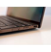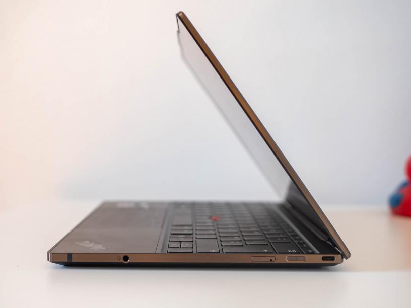 Страните на ThinkPad Z13 Gen 1 предлагат много скромна селекция от портове. Всъщност вляво има един USB-C 4.0 порт и нищо друго, а вдясно е втори такъв порт, както и жак за слушалки, слот за Nano SIM карта и бутонът за включване. USB-C 4 портовете поддържат трансфер на данни със скорост до 40GBit/s, DisplayPort 1.4a и Power Delivery 3.0, така че можете да използвате и двата за свързване на външни екрани или зареждане.