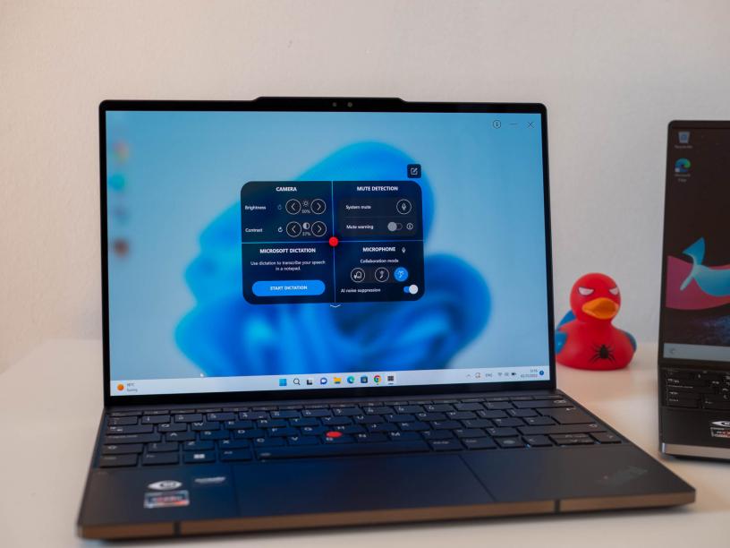 Извън тях със сигурност попада новата функция с двойно потупване на иконичния TrackPoint. Тази опция изкарва бързо меню с инструменти за комуникация, през което можете да настроите камерата, микрофона или шумопотискането, като дава бърз достъп до инструмента на Microsoft за транскрибиране на реч. Последното е малко излишно, тъй като с Win+H изкарвате същия инструмент, без да се отваря Notepad. За разлика от други ThinkPad модели тук няма отделни бутони, които да се използват с TrackPoint, а вместо това те са вградени в тракпада. Това леко обезсмисля съществуването му, тъй като е далеч по-лесно просто да се използва тракпадът.