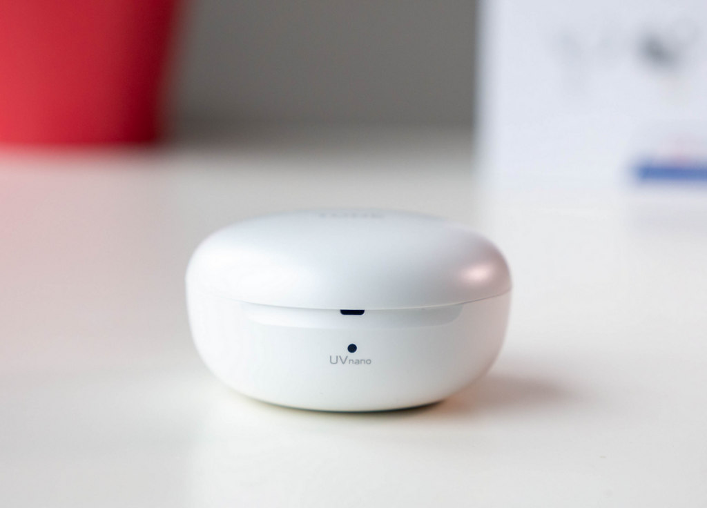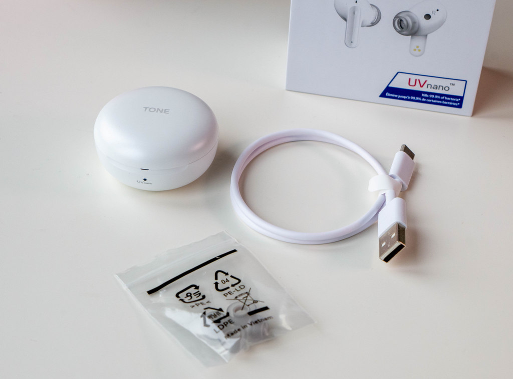 В кутийката има и друга изненада - UV светлина, която служи за дезинфекциране на мрежата на говорителите (според LG за 5 минути това убива до 99.9% от бактериите). Тя се активира при зареждане на кутийката (с кабел или безжично), за да не консумира допълнителна енергия. Иначе вътре има и сини LED светлини, които светват при отваряне на кутийката, ако слушалките са в нея. Това е полезно при ползване на тъмно, но щеше да е добре диодите да светват и при отваряне, и когато слушалките не са вътре.