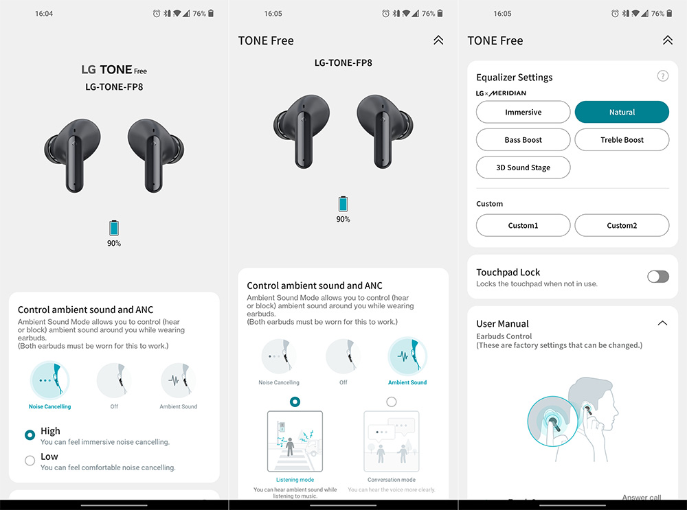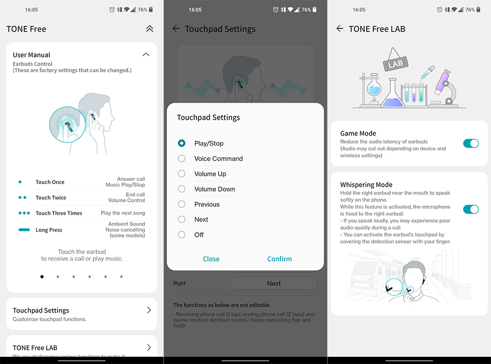 Тази опция както и други функции на слушалките се управляват през приложението Tone Free. През него можете да промените степента на шумопотискане (ниска и висока), да приложите еквалайзер с готови настройки (създадени с компанията Meridian) или със свои, да промените жестовете за управление, да заключите сензорната зона, да обновите софтуера и др. В секцията Tone Lab е споменатият режим шепот плюс геймърска опция, която редуцира времезакъснението.