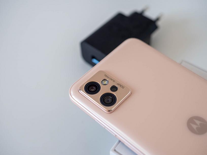 Камерите на гърба на moto g32 са общо три, като конфигурацията е непроменена спрямо неговия предшественик. Водещият сензор е с резолюция 50MP и Quad Pixel технология, която комбинира четири пиксела в един. Освен него има 8MP ултраширокоъгълна камера, както и 2MP макрокамера, която служи и като сензор за дълбочина. Макрокамерата е с фиксиран фокус на около 4 см, което изисква известно свикване при правенето на макроснимки.