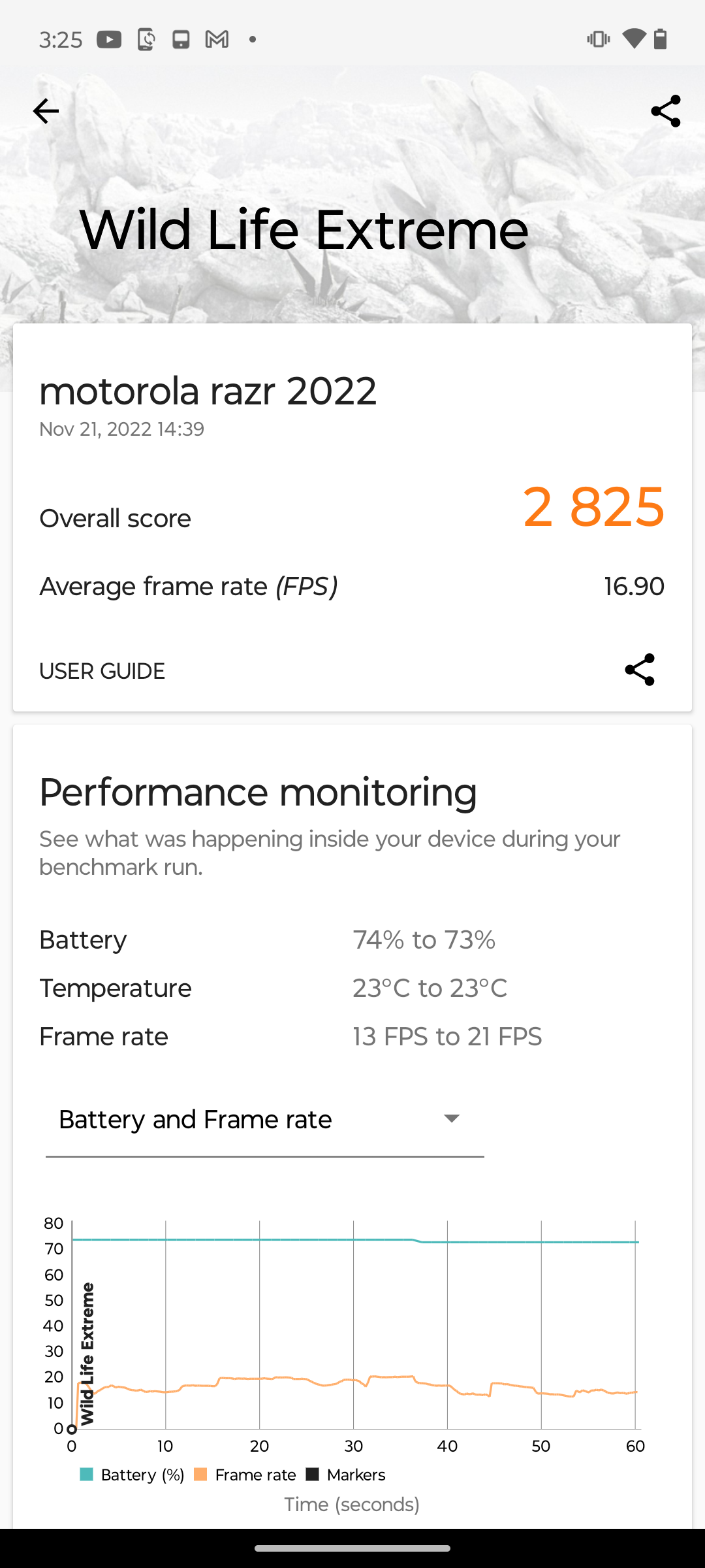 В ежедневието това не си проличава по никакъв начин и Razr 2022 работи великолепно без никакви засечки. Всякакви приложения, включително и игри, работят и зареждат бързо и няма осезаеми забавяния и засечки. В сравнителните тестове обаче се вижда, че работата на процесора е ограничена и резултатите от Razr 2022 са по-ниски, отколкото в конвенционални модели със същия чип. При продължително натоварване се вижда силно намаляване на производителността на чипсета, което обаче се случва консистентно и очевидно е целенасочено, за да се контролира и отделянето на топлина.