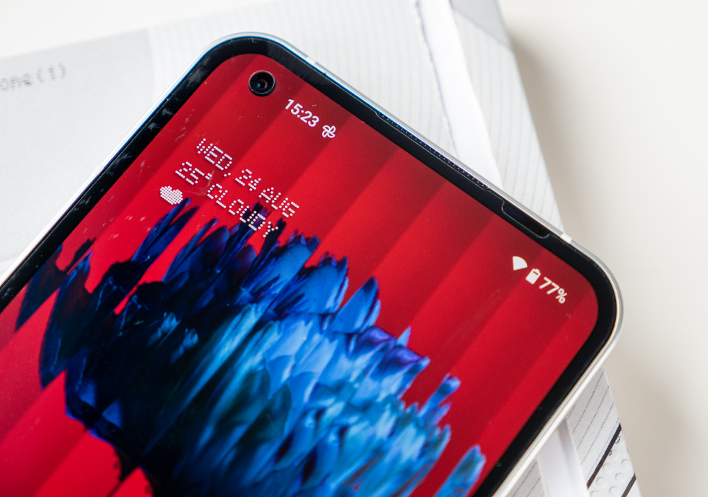 Отпред прави впечатление симетричната рамка около дисплея, което не се среща често при телефоните с Android. Всъщност това направо е рядкост, а наскоро видяхме такива при Galaxy S22 и S22+. Nothing постига симетричните рамки, като ползва гъвкав OLED панел с технологията, която ни е позната от iPhone - при нея конекторите на дисплея са скрити зад него, което на свой ред позволява постигането на симетричен дизайн.