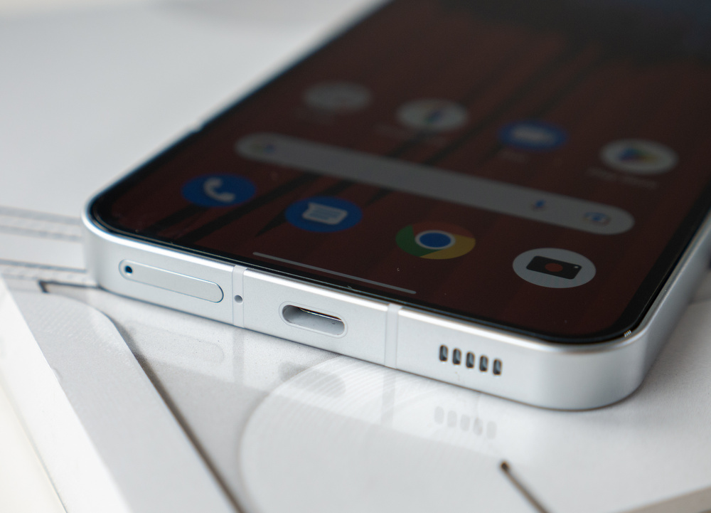 Това внимание към детайлите продължава и при останалите елементи от дизайна. Така например всички елементи върху рамката са приятно центрирани - бутоните за звука и за включване, микрофонът в горната част, USB-C портът, отворите за високоговорителя и мястото за SIM карти в долната част. Това са малки, но важни неща от цялостно потребителско изживяване и ни напомнят на подхода на Apple. Точно както и дизайна на телефона напомня на iPhone.