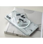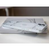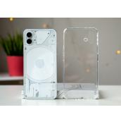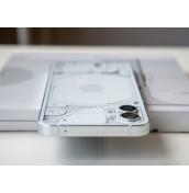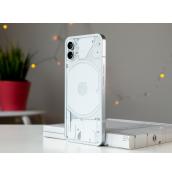 Първият телефон на Nothing определено привлича вниманието. Устройството продължава дизайнерската линия, която започна със слушалките Ear 1 и залага на ползването на прозрачни материали. В случая прозрачен е задният плосък панел от стъкло Gorilla Glass 5, който дава поглед към компонентите и системата с LED светлини Glyph, за която ще стане дума по-късно. Отпред посреща плосък панел от същото стъкло, а алуминиевата рамка е плоска и с матова текстура.