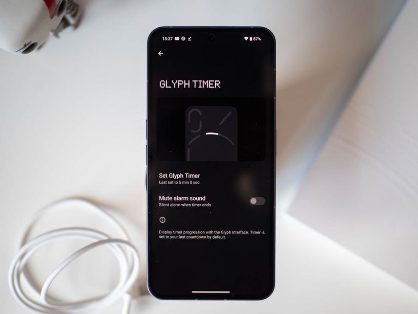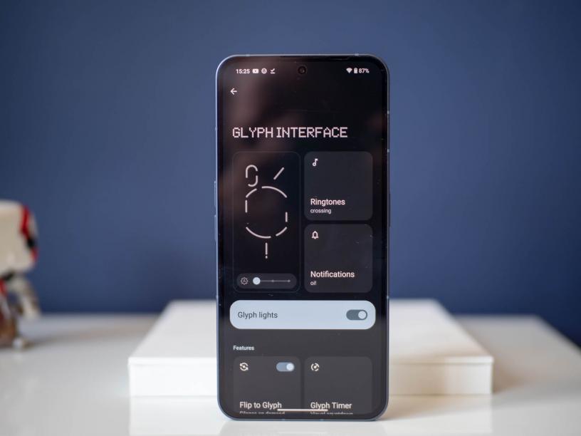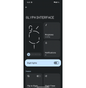 Естествено, най-интересната добавка в телефона е Glyph - системата от LED светлини на гърба, която се използва основно за известия. В специалното меню в настройките има достъп до всички функции и настройки, като тази година може да се контролира яркостта на светлините. Част от експерименталните функции за момента работи само с Uber и позволява проследяване на прогреса на пътуването чрез Glyph светлина на гърба.