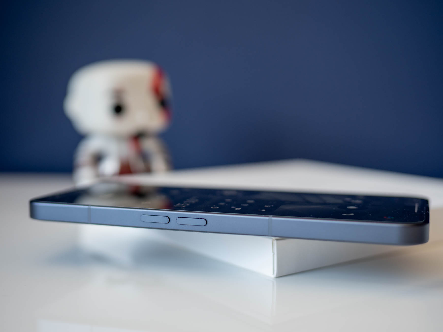 Алуминиевата рамка е по-тънка от миналата година, като матираното покритие я прави приятна на докосване и подобрява захвата. Вляво са два отделни бутона за управление на звука, докато този за заключване е вдясно. Бутоните кликат много приятно и са удобни и осезаеми. Отгоре има микрофон, докато отдолу са слотът за SIM, USB-C входът, основният микрофон и основният говорител. Другият говорител е над дисплея, като комбинацията предоставя приятен и сравнително богат звук, в който се чуват ниски тонове, както и добро възпроизвеждане на гласове. Силата им също е повече от задоволителна, а цялостното впечатление е много приятно.