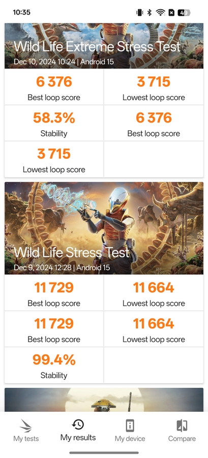 Това е достатъчно мощна комбинация, която осигурява производителност за всички задачи. Системата работи пъргаво, всичко се отваря бързо, анимациите са плавни, а многозадачната работа е безпроблемна. Това се отразява и в резултатите от сравнителните тестове, които са много високи и са сравними с тези на Snapdragon 8 Elite (можете да ги видите в ревюто ни на Realme GT 7 Pro). В стрес тестовете се вижда, че стабилността е около 60%.