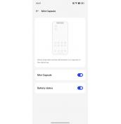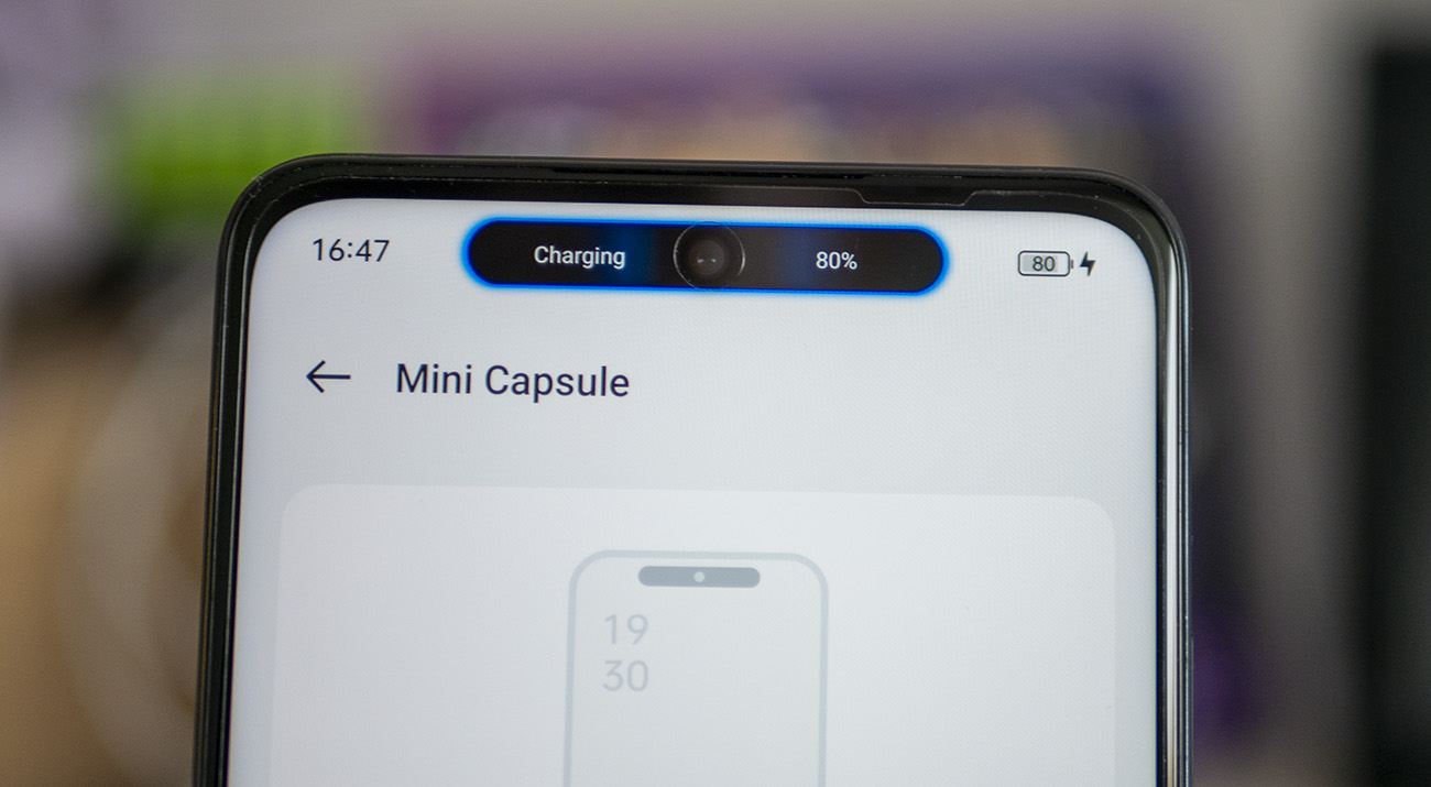 Mini Capsule е доста интересно решение, което добавя полезна функционалност в зоната около селфи камерата. Засега то обаче е доста ограничено, но се надяваме в бъдеще да бъдат добавени повече опции. Тази секция показва индикатор за заряда на батерията с анимирани ефекти при зареждане и при падане до ниско ниво. В бъдеще се планира добавянето на визуализация за изминатите стъпки и изразходвани данни.