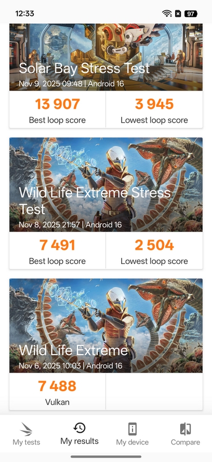 В същото време при продължително високо натоварване мощността намалява значително. Това се вижда в стрес тестовете с 3DMark, които завършиха със стабилност от около 30% – това показва колко намалява производителността с повишаване температурата на чипсета. По време на стрес тестовете корпусът на телефона се нагря значително. Изключително малко вероятно е обаче да получите подобно натоварване в ежедневието.