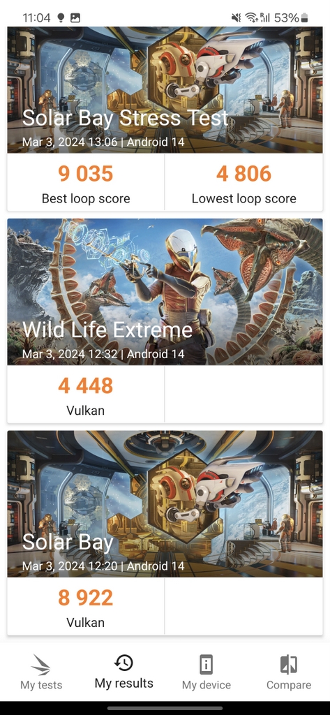 Предвид на компактните размери на Galaxy S24 не очаквахме кой знае какви възможности за поддържане на производителността във времето дори и с надградената система за охлаждане. Стрес тестовете показаха стабилност на резултатите около 50%, което е очаквано заради физическите ограничения на модела. Пак трябва да направим уговорката, че става дума за краен случай, който не е индикативен за нормалната ежедневна употреба.