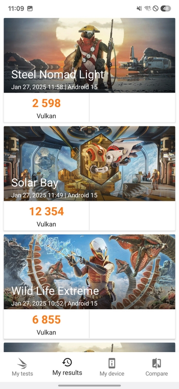 Сравнителните тестове показват високата производителност на чипсета. В Geekbench 6 точките са около 3200 за едноядрения и 10 100 за многоядрения тест при 2300 и 7000 за Galaxy S24 Ultra. В 3DMark Solar Bay точките са над 12 000 при около 8500 за Galaxy S24 Ultra, а при Wild Life Extreme беше постигнат резултат около 7000 точки при около 5100 преди година. Стрес тестовете показват стабилност около 55%, което не е особено оптимално, но температурата на устройството не надвишава 43 градуса.