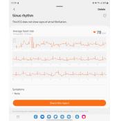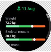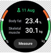 Отчитането на телесната композиция чрез анализ на биоелектричения импеданс пак става, като се докоснат двата бутона, в които се намират електроди. Измерването отнема известно време и после извежда данни за телесните мазнини, мускулите, водата в тялото и т.н. По същия начин можете да измерите кръвното налягане и да направите електрокардиограма, но с някои уговорки.