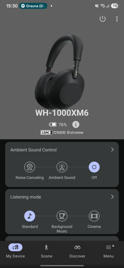 Sony WH-1000XM6 поддържат и различни режими на звука, включително нова функция за фонова музика, която създава усещането, че сте в кафене или хол, както и кино режим с технологията 360 Reality Audio Upmix, който се опитва да създаде обемен звук при гледане на видео. В зависимост от съдържанието това може да работи изненадващо добре, но не очаквайте чудеса. Животът на батерията остава същият като при XM5 - 30 часа с едно зареждане при включено шумопотискане и 40 часа с изключено. Триминутно зареждане осигурява три часа за възпроизвеждане на музика.