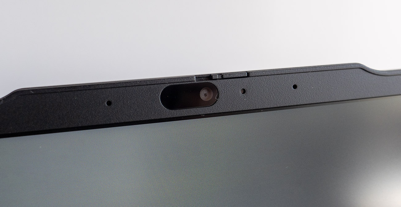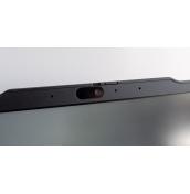 При отваряне на капака откриваме клавиатура (без цифров блок), тъчпад, бутон за включване с вграден четец на отпечатъци, а над екрана има уеб камера с механизъм за прикриване. Зоната над камерата е леко издигната, което помага за по-лесното отваряне.