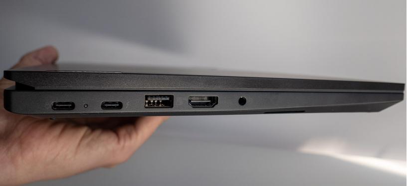 Разположението на портовете е както следва - отдясно са USB Type-A и LAN портове, а отляво има 2 х USB Type-C, HDMI, USB Type-A и комбиниран 3.5 мм жак за слушалки и микрофон.