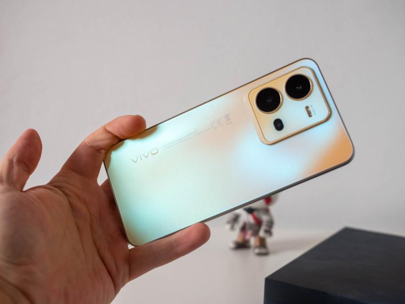 Предната страна е напълно стандартна, с малък прорез в горния край на дисплея, както и тънки странични рамки, придружени от по-плътна брадичка. В долната част има сензор за пръстови отпечатъци, като Vivo не споделя какво стъкло използва за дисплея. Страничната рамка оставя приятно усещане, въпреки че е направена от пластмаса. Вдясно са бутоните за заключване и контрол на звука, докато отдолу са говорителят, вход за USB-C и хибриден слот за SIM и microSD карти. И тук няма формална защита от вода и прах, докато говорителят е с достатъчно силен звук.