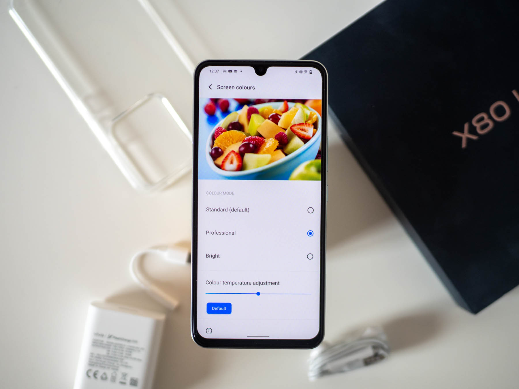 Още кутията на X80 Lite 5G оставя визуално впечатление, в случая за премиум устройство. Тя е по-тънка, но широка, така че да хване включените вътре зарядно, кабел, силиконов кейс, преходник за слушалки и слушалки с 3.5 мм жак. Самият смартфон е с много класически дизайн, който очевидно е продължение на решенията във V23 (ревю) и отново залага на плоска странична рамка.