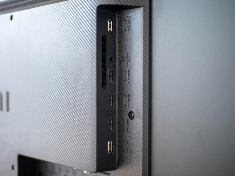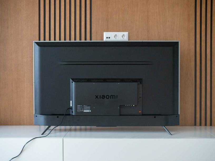 Гърбът е от черна пластмаса, която не изглежда впечатляващо, но е напълно обичайна. Всички портове са в лявата страна, докато кабелът за захранване излиза отдясно, което е важен детайл при избора на място, на което да стои екранът. Отдолу е система от общо 6 говорителя с две пищялки и четири уфъра, които са с обща мощност до 30 вата. Звукът е приличен, без изразени басове и върши работа, без да оставя специфично добро или лошо впечатление. Със сигурност за най-добро кино изживяване ще искате външни говорители, като Xiaomi предлага саундбар в своето портфолио.