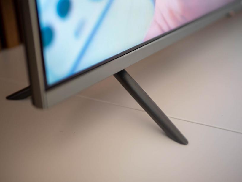 Визуално Q1E TV е приятен и ненатрапчив, което е изключително голямо предимство. Рамките около екрана му са изключително тънки, като отдолу има дискретно лого на производителя. Цялата рамка е в тъмносив цвят, който изглежда приятно когато екранът не работи и не разсейва, докато гледате или играете на него. В кашона на телевизора има включени два крака, които са с формата на Y и се монтират сравнително лесно, макар да е необходима отвертка. Застанал на тях, телевизорът е стабилен и цялостната визия е завършена и отново ненатрапчива, като има и опция за VESA стойка, с която да го закачите директно на стената.