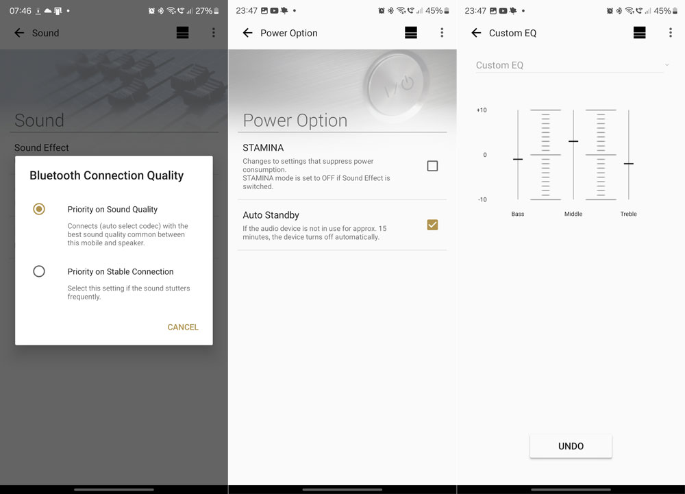 През приложението, чиито опции са доста ограничени, можете още да обновите софтуера на устройството, да промените опцията за автоматично изключване, когато не се използва за по-дълъг период от време, да настроите еквалайзер с базови опции и да изберете какъв да е приоритетът на Bluetooth връзката – върху стабилността или върху качеството на звука.