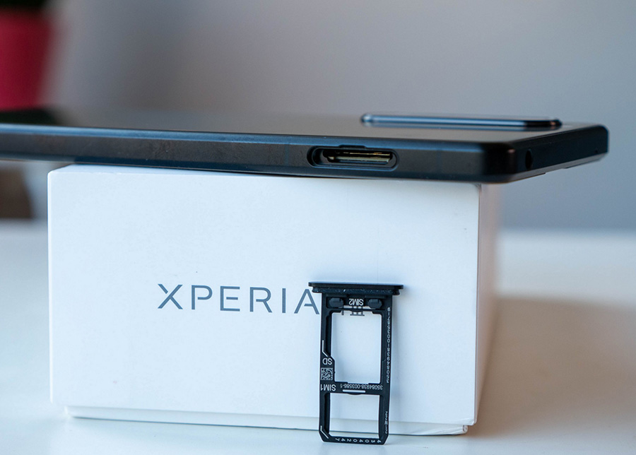 Достатъчен е един поглед, за да установим, че устройството пред нас е дело на Sony. Моделът прилича много на миналогодишния Xperia 1 II и има почти идентични размери, макар че дебелината му се е увеличила с части от милиметъра, а към теглото има няколко грама в повече. Основната разлика на пръв поглед е текстурата на телефона - страничната метална рамка вече е матова, каквото е и стъклото Gorilla Glass Victus върху задния панел. Черната матова текстура изглежда и се усеща много добре, а освен това има предимството, че не задържа отпечатъци. Стъклото отпред също е от този тип, който обещава подобрена устойчивост.