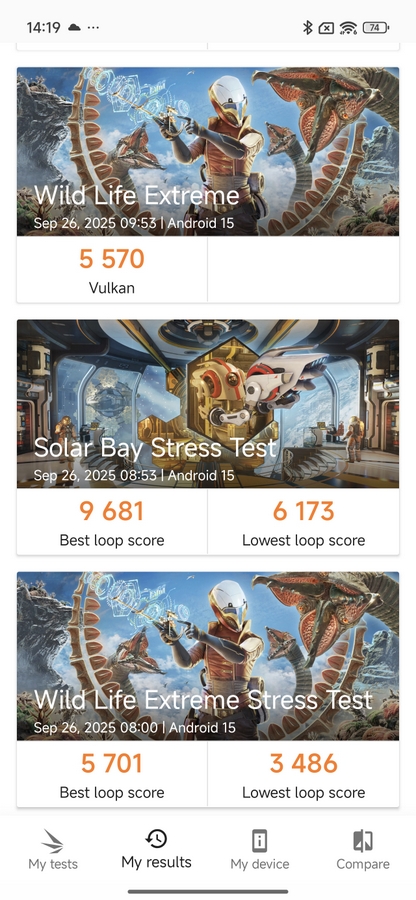 Всичко това очаквано осигурява много висока производителност, която може да се види и в резултатите от сравнителните тестове. Устройството може да се справи с всичко, включително и с по-тежки игри, а работата на системата е плавна и без засечки. Добро впечатление прави и охладителната система – Xiaomi 15T Pro успя да постигне в стрес тестовете в 3DMark стабилност от около 60%, което показва колко се понижава производителността при високо игрово натоварване за период от 20 минути.