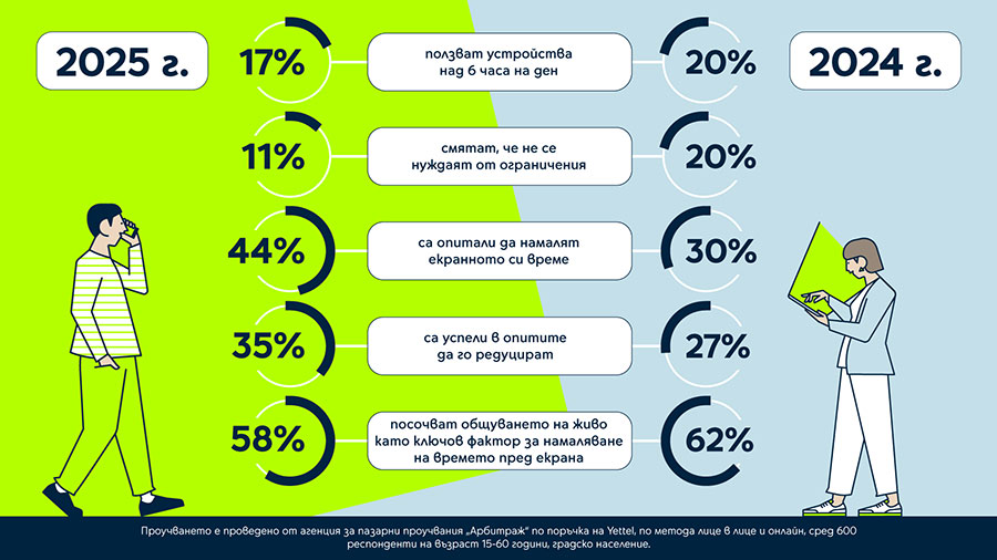 Добрата новина – и успеваемостта расте. 35% от опиталите през 2025 г. казват, че са успели да намалят екранното си време, спрямо 27% година по-рано.